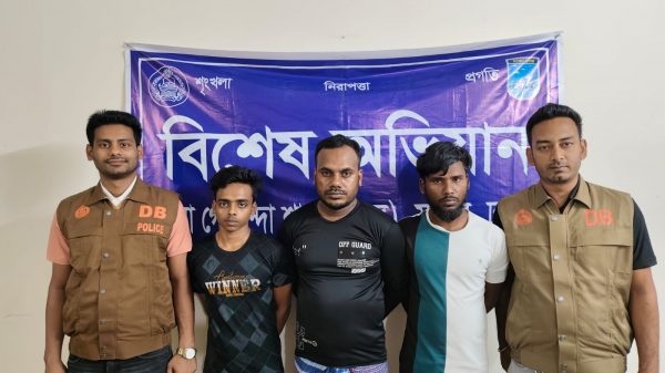 ঢাকা জেলা পুলিশ সুপার মোঃ আনিসুজ্জামান, সাধারণ সম্পাদক, বাংলাদেশ পুলিশ সার্ভিস এসোসিয়েশন এডহক কমিটি-২০২৫ এর নির্দেশনায় বিশেষ অভিযান পরিচালনাকালে ঢাকা জেলার ডিবি (উত্তর) , এর অফিসার ইনচার্জ মোঃ জালাল উদ্দিন এর নেতৃত্বে এসআই (নিঃ) শেখ সেকেন্দার আলী অফিসার ও ফোর্স সহ অদ্য ২০/০৩/২৫ খ্রি. তারিখ রাত ২০.১৫ ঘটিকায় ঢাকা জেলার সাভার থানাধীন রাজাশন এলাকা হইতে আসামী ১। রিপন মোহাম্মদ প্রামানিক (২৯), পিতা- আহাদ আলী প্রামানিক, মাতা-গোলে খাতুন, সাং-ঘুগুদাহ, থানা-সাথিয়া, জেলা-পাবনা, এ/পি সাং-সাভার রাজাশন সেলিমের বাড়ীর ভাড়াটিয়া, থানা-সাভার, জেলা-ঢাকা, ২। মোঃ আব্দুল কালাম (২৪), পিতা- মোঃ মোকছেদ মন্ডল, মাতা-মোছাঃ রাশিয়া বেগম, সাং-দখলপুর, থানা-হরিণাকুন্ড, জেলা-ঝিনাইদহ, এ/পি সাং-সাভার রাজাশন সেলিমের বাড়ীর ভাড়াটিয়া, থানা-সাভার, জেলা-ঢাকা, ৩। মোঃ ফারুক মিয়া (২৮), পিতা- মৃত সোরহাব মিয়া, মাতা- ফরিদা বেগম, সাং-মনমত, থানা-সুন্দরগঞ্জ, জেলা-গাইবান্ধা, এ/পি সাং-সাভার রাজাশন সেলিমের বাড়ীর ভাড়াটিয়া, থানা-সাভার, জেলা-ঢাকাদের গ্রেফতার করেন।