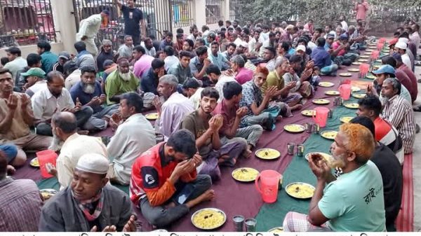 রোববার, মার্চ ২৩, ২০২৫, প্রতিবছরের ন্যায় পথচারী নারী-পুরুষ, রিক্সা চালক, এতিম ও দুস্থ মানুষরা ইফতার করছেন জিয়াউর রহমান শিশু হাসপাতালে। বগুড়া শহরের দত্তবাড়ী এলাকায় অবস্থিত জিয়াউর রহমান শিশু হাসপাতাল চত্বরে বিকেল থেকে সারিবদ্ধভাবে বসেন শত শত মানুষ। তাদের কেউ কেউ স্কুলছাত্র, কেউ ব্যবসায়ী, এতিম, ভিক্ষুক আবার অনেকেই ভ্যান ও রিকশা চালক। সাইরেনের আওয়াজ শুনার সঙ্গে সঙ্গে একসাথে ইফতার করেন প্রায় ৫ শতধিক মানুষ। ইফতারে উপস্থিতি বেড়েছে বিগত বছরগুলোর চাইতে এবছর। বিএনপি মিডিয়া সেলের রাজশাহী ও রংপুর বিভাগীয় কো-অর্ডিনেটর সিনিয়র সাংবাদিক কালাম আজাদ বলেন, বিএনপির ভারপ্রাপ্ত চেয়ারম্যান তারেক রহমানের নির্দেশে হাসপাতাল চত্বরে প্রতিবছর এই ইফতার কার্যক্রম চলে আসছে। মানবিক এ কার্যক্রম ভবিষ্যতেও অব্যাহত থাকবে। জিয়াউর রহমান শিশু হাসপাতালের প্রধান প্রশাসনিক কর্মকর্তা সৈয়দ আমিনুল হক দেওয়ান সজল জানান, রমজান আত্মশুদ্ধি ও সংযমের মাস। সমাজের নিম্নআয়ের মানুষ, পথচারী ও সুবিধাবঞ্চিতরা যেন ইফতার থেকে বঞ্চিত না হন সে জন্যই আমাদের এই ক্ষুদ্র প্রয়াস। চেলোপাড়া বস্তির বিধাব আছমা বেগম দুই ছোট সন্তান নিয়ে রমজানের প্রথম দিন থেকে এখানে ইফতার করে। আছমা বেগম বলেন, প্রতিদিন গবীর মানুষকে ইফতার খাওয়ানোর জন্য দোয়া করি। রিকশা চালক মামুন বলেন, সোনাতলায় আমার বাড়ি। ঈদে শহরে থেকে রিকশা চালিয়ে টাকা জমাচ্ছি ছেলে মেয়েদের কেনাকাটার জন্য। প্রতিদিন এই রাস্তায় ভাড়া নিয়ে যাওয়ার সময় দেখি বিকেল থেকেই অনেক মানুষ দাঁড়িয়ে থাকে, তাই আমি দেখতে এসে নিজেও ইফতার করলাম। একসাথে এত মানুষের সাথে আগে কখনো ইফতার করিনি। ইফতারের এই আয়োজনে নিয়মিত স্বেচ্ছাসেবকের কাজ করেন, জেলা স্বেচ্ছাসেবকদলের যুগ্ম সাধারণ সম্পাদক মো:শাহ আল আমিন সরকার, মিলন, মোঃ সম্রাট হোসেন, আনারুল ইসলাম ছোটন, রানা ইসলাম, রাশেদ, রনি, নিশান, উজ্জল হোসেন।