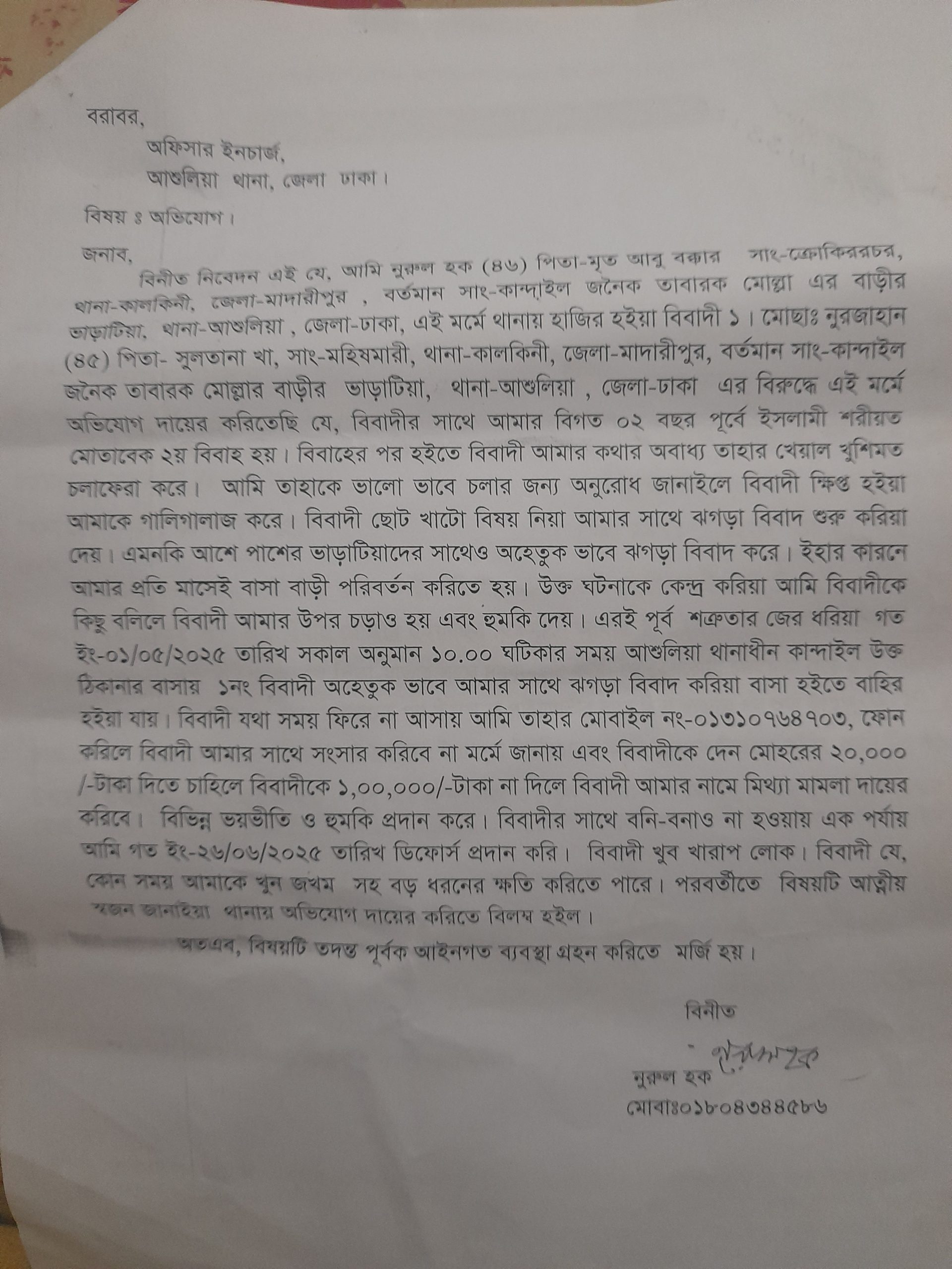 বর্তমানে তিনি থাকেন সাং.কান্দাইল,জনৈকআ তোবারক মোল্লা এর বাড়ির ভাড়াটিয়া, থানা. আশুলিয়া, জেলা. ঢাকা। এসময় তিনি সাংবাদিকদের বলেন মোছা. নুরজাহান বেগম (৪৫)পিতা. সুলতান খা,সাং.মহিষ মারী, থানা.কালকিনী,জেলা. মাদারীপুর। বর্তমানে সাং কান্দাইল, জনৈক তোবারক মোল্লার ভাড়াটিয়া, থানা. আশুলিয়া, জেলা. ঢাকা। নুরজাহান বেগমের সাথে আমার বিগত দুই বছর পুর্বে ইসলামি শরীয়ত মোতাবেক দ্বিতীয় বিবাহ হয়।বিবাহের পর হইতে বিবাদী আমার কথার অবাধ্য তাহার খেয়াল খুশি মত চলাফেরা করে।আমি তাহাকে ভালোভাবে চলার জন্য অনুরোধ জানালে নুরজাহান বেগম ক্ষিপ্ত হইয়া আমাকে গালি গালাজ করে।নুরজাহান বেগম ছোটখাটো বিষয় নিয়ে আমার সাথে ঝগড়া বিবাদ শুরু করিয়া দেয় । এমনকি আশেপাশের ভাড়াটিয়াদের সাথেও অহেতুক ভাবে ঝগড়া বিবাদ করে। ইহার কারণে আমার প্রতি মাসেই বাসা বাড়ি পরিবর্তন করতে হয়।