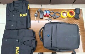 উক্ত মাইক্রোবাস তল্লাশী কালে তাদের নিকট থাকা ব্যাগের ভিতরে ০৪টি র্যাবের ব্যবহৃত জ্যাকেট, ০১ টি কালো রঙের হ্যান্ডকাফ, ০১ টি খেলনা সদৃশ ওয়াকিটকি, ০১ টি সিগন্যাল লাইট, ০১ টি ইলেকট্রিক শক দেওয়ার যন্ত্র ও ০২ টি স্কচটেপ পাওয়া যায়।