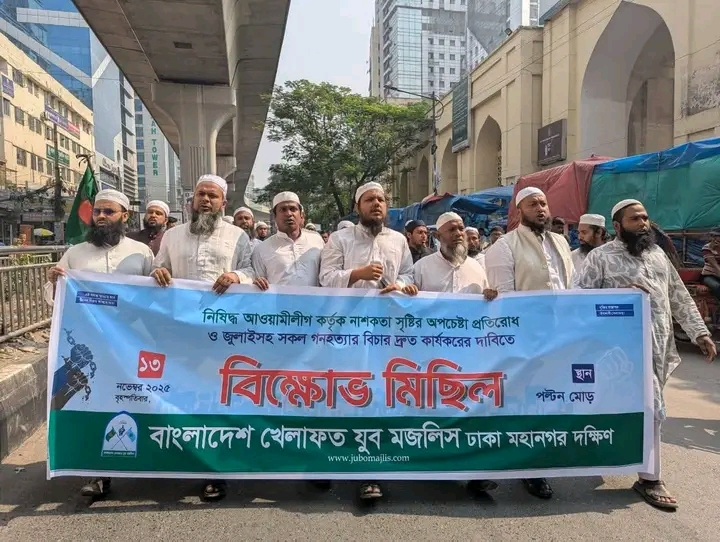 নিষিদ্ধ আওয়ামী লীগ কর্তৃক দেশজুড়ে নাশকতা সৃষ্টির অপচেষ্টা প্রতিরোধ এবং জুলাইসহ অতীতের সব গণহত্যার বিচার দ্রুত কার্যকরের দাবিতে আজ বৃহস্পতিবার (১৩ নভেম্বর ২০২৫) বাংলাদেশ খেলাফত যুব মজলিসের উদ্যোগে দেশব্যাপী বিক্ষোভ মিছিল ও প্রতিবাদ সমাবেশ অনুষ্ঠিত হয়েছে।