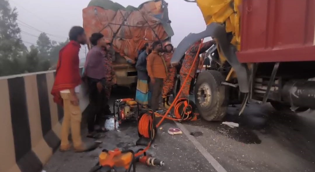 ফায়ার সার্ভিস ও স্থানীয় সূত্রে জানা গেছে, ভোর ৬ টার দিকে এক্সপ্রেসওয়ের মাওয়ামুখী লেনে একটি ট্রাক যান্ত্রিক ত্রুটির কারণে দাঁড়িয়ে মেরামত করা হচ্ছিল। এসময় মাওয়াগামী দ্রুতগতির অন্য একটি ট্রাক নিয়ন্ত্রণ হারিয়ে দাঁড়িয়ে থাকা ট্রাকটির পেছনে সজোরে ধাক্কা দেয়। এতে সামনের ট্রাকের হেলপার ছিটকে পড়ে আহত হন এবং পেছনের ট্রাকের হেলপার কেবিনের ভেতরে আটকা পড়েন।