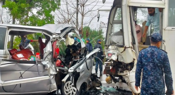 বাগেরহাটের রামপাল এলাকায় নৌবাহিনীর একটি স্টাফ বাস ও বরযাত্রীবাহী মাইক্রোবাসের মুখোমুখি সংঘর্ষে নবদম্পতিসহ অন্তত ১৩ জন নিহত হয়েছেন। বৃহস্পতিবার (১২ মার্চ) বিকেলে খুলনা-মোংলা মহাসড়ক-এর বেলাইব্রিজ এলাকায় এই ভয়াবহ দুর্ঘটনা ঘটে। এতে বিয়ের আনন্দ মুহূর্তেই শোকে পরিণত হয়।