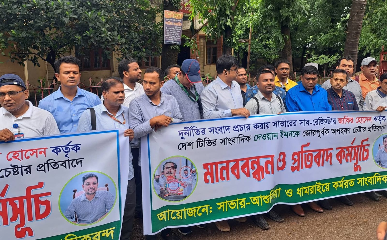 সাভারের সাব-রেজিস্ট্রার জাকির হোসেনের দুর্নীতি নিয়ে সংবাদ প্রচারের জেরে দেশ টিভির স্থানীয় প্রতিনিধি দেওয়ান ইমনের ওপর হামলা এবং অপহরণ চেষ্টার প্রতিবাদে মানববন্ধন ও প্রতিবাদ কর্মসূচি পালন করেছেন সাংবাদিকরা।মঙ্গলবার দুপুরে সাভার মডেল থানার সামনে এই কর্মসূচিতে অংশ নেন সাভার, আশুলিয়া ও ধামরাইয়ে কর্মরত শতাধিক সাংবাদিক। পরে প্রতিবাদের অংশ হিসেবে এক ঘণ্টার 'কলম বিরতি' পালন করেন তারা।মানববন্ধনে থেকে বক্তারা বলেন, সংবাদ প্রকাশের জেরে ক্ষিপ্ত হয়ে দেশ টিভির প্রতিবেদক দেওয়ান ইমনকে জোরপূর্বক তুলে নেওয়ার চেষ্টা করেছেন সাব-রেজিস্ট্রার জাকির হোসেন ও তার লোকজন। এই ঘটনা শুধু ব্যক্তির উপর আক্রমণ নয়। বরং স্বাধীন সাংবাদিকতা, মতপ্রকাশের স্বাধীনতা ও গণতান্ত্রিক মূল্যবোধের উপর সরাসরি আঘাত।